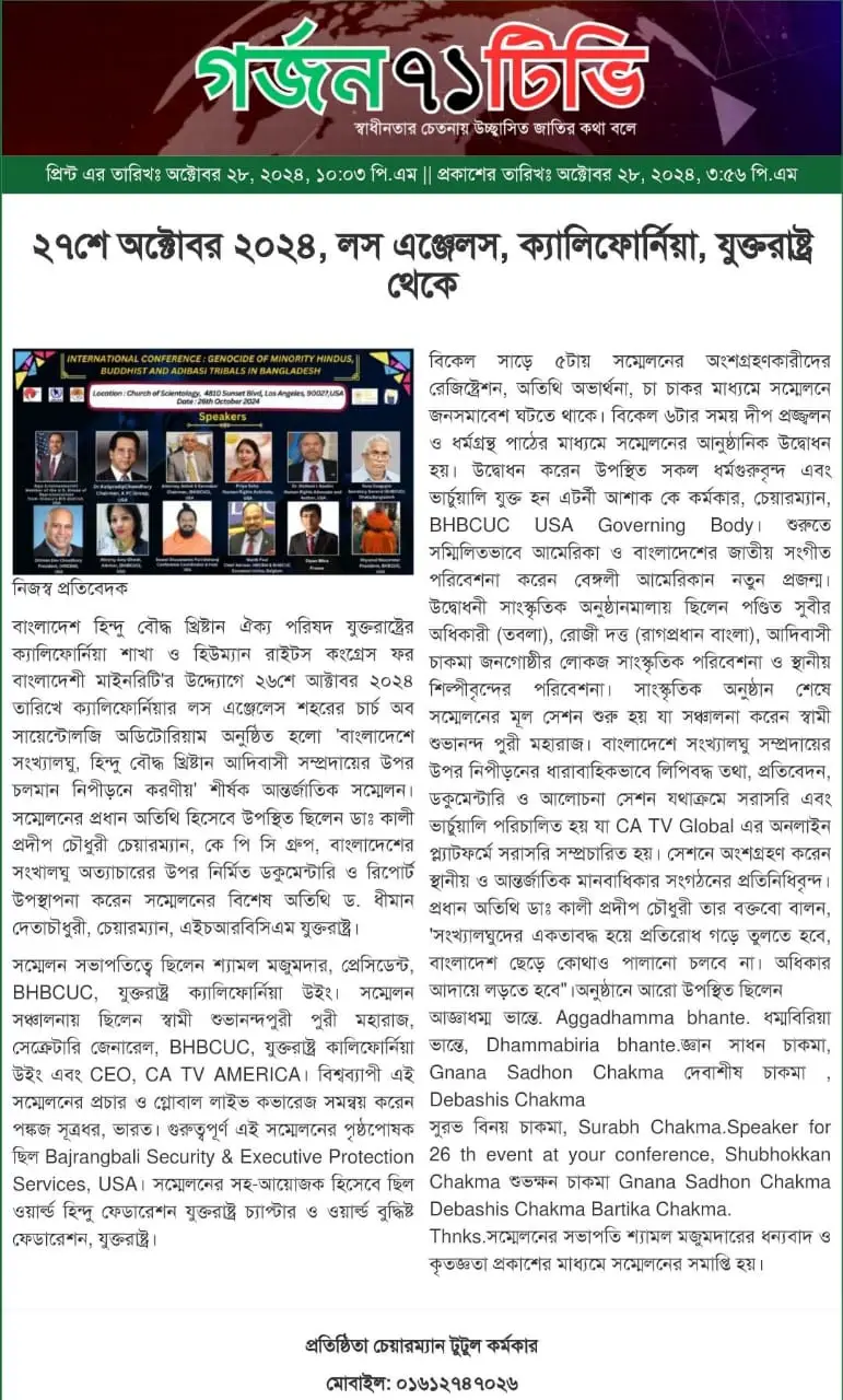 An international conference addressing the Ethnic Cleansing of Minority Hindus, Buddhists, and Adivasi Tribals in Bangladesh convened in Los Angeles on October 26, 2024, with a powerful call to the global community: to end the atrocities against minorities in Bangladesh. Hosted by the Bangladesh Hindu Buddhist Christian Unity Council (BHBCUC) USA, World Hindu Federation (WHF) USA Chapter, Human Rights Congress for Bangladesh Minorities (HRCBM), and World Buddhist Federation USA, the conference sought to galvanize international support to protect Bangladesh's vulnerable minority populations from escalating violence and displacement.